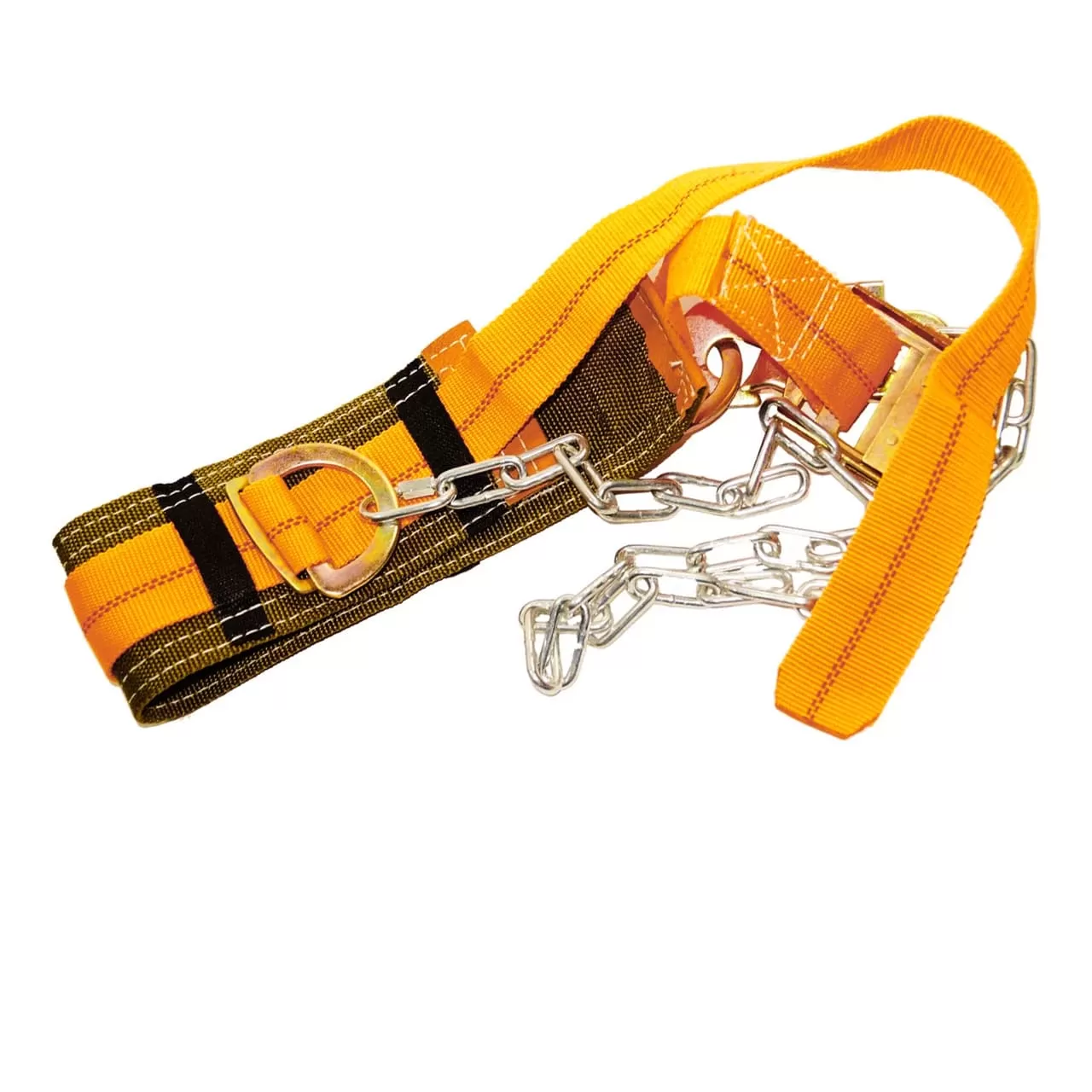 Пояс состоит из ремня с пряжкой, кушака и двух D-колец и стальной цепи с крюком. Конструкция пояса позволяет подгонять его по фигуре — обхват составляет 74-125 см. Предохранительный безлямочный пояс со стропом из прочной стальной цепи предназначен для удержания и позиционирования в рабочем положении при различных видах работ проводимых на высоте.